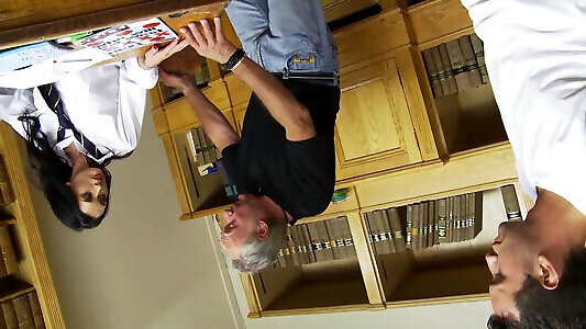 Redhead granny and teen boys have hot office 3some