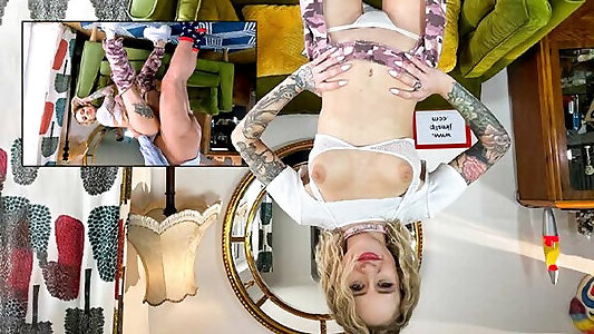 Older plump grandmother with youthfull doll fapping on the couch