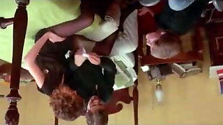 Two gorgeous German women sharing a loaded cock on the kitchen table